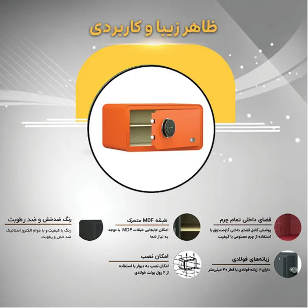 - رمز صندوق امکان ثبت 8 کاراکتر را دارد. در صورت ورود 3 بار رمز اشتباه و یا برخورد ضربه به بدنه، آژیر خطر رمز فعال میشود.